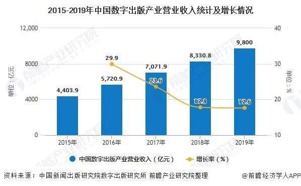 网络阅读的兴起带来数字出版的快速发展,2019年中国数字出版产业营收超9800亿元,增速远高于新闻出版业营收规模整体增速,数字出版行业的快速发展也推动了中国新闻出版业产业的转型与融合发展。