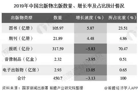 在互联网大数据时代,由于网络阅读、移动阅读的兴起、兴盛,传统纸介质出版物衰弱,新兴出版蓬勃发展是大势所趋。2019年,全国共出版图书、期刊、报纸、音像制品和电子出版物450.70亿册(份、盒、张),较2018年降低3.1%,值得注意的是电子出版物2.9亿张,增长13.1%,占0.7%,而传统介质出版物中仅有图书出版数量有所增长。