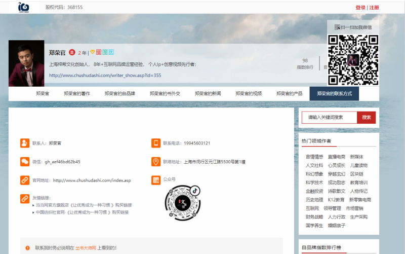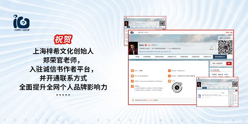 近日,上海梓希文化CEO郑荣官先生,受邀入驻诚信书作者平台。同时,开通了其联系方式,全面提升了郑先生的全网个人品牌影响力。