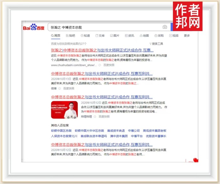 通过互联网平台高效、快捷的信息发布,以张瀚之先生为核心的关键词成功入驻360、搜狗、百度等权威平台,要想获得相关信息,只需在平台页面搜索“张瀚之”相关关键词,便能获取大量新闻与品牌内容,得益于互联网平台的高效推广,不仅提升了双方在资源优化方面的作用,而且更在个人品牌打造与信用资本积累的轨道上实现提速、增效,其行业影响力不断攀