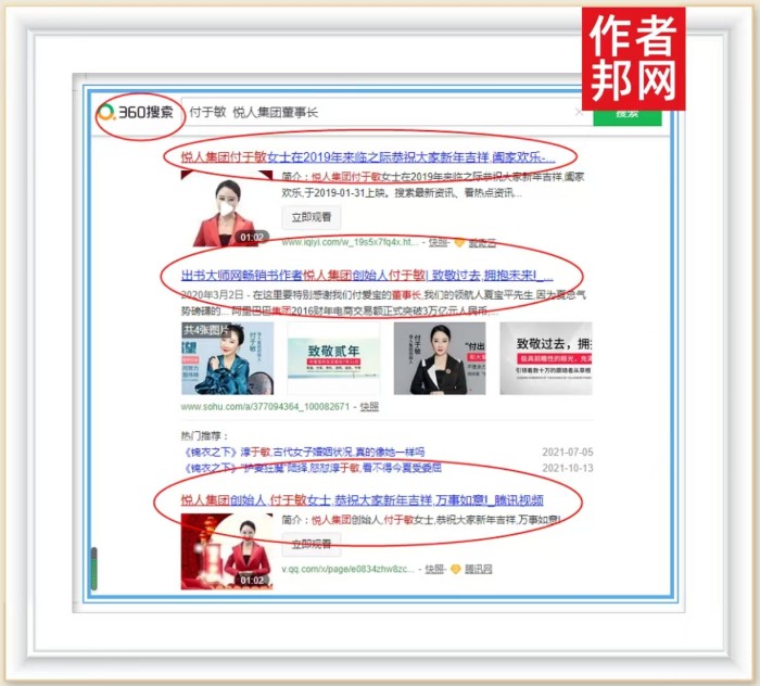 360、搜狗、百度三大搜索引擎,以庞大的数据库作为支撑,稳定的网页浏览为核心,不断积累内容信息和数据流量,并且会根据用户搜索记录,检索出相关信息进行推送,为用户的使用提供极大的便利。随着付于敏女士相关新闻进入平台,搜索人物或与其相关内容的信息,都会推送品牌内容,快速、便捷的完成流量推送。