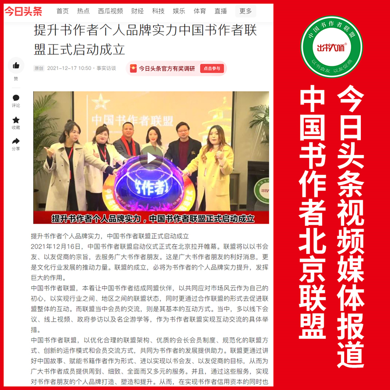 2021年12月16日,中国书作者联盟北京站举办了启动仪式并宣告正式成立。本活动,获得了许多知名媒体的关注和报道。当中,包括了CCTV央视视频、央视视频、新浪视频、新华视频、网易新闻、天津卫视视频、腾讯视频、搜狐视频、今日头条以及爱奇艺等众多有分量的媒体。相关报道,也已于近日在全网渠道进行了发布。