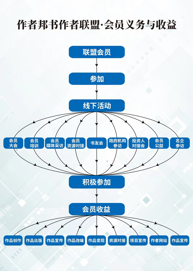 在联盟的会员义务层面,作者邦主张大家积极参与到组织的各项线下活动当中,以此,来提升自身的品牌效应与影响力。同时,也为后续收获各自的收益,打下坚实的基础。在线下活动的模式上,作者邦推出了大会、培训、媒体采访、资源对接、书友会、政府机构参访、投资人对接会、公益以及名企参访等。通过这些多元化的活动,来提升广大会员的互助积极性、品牌影响力以及知名度等。