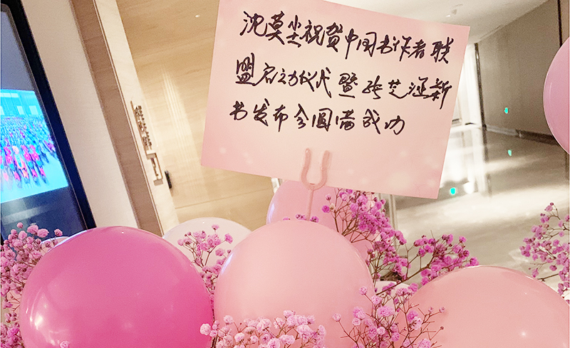 作为本摄传媒创始人的沈莫尘老师,以特邀嘉宾的特殊方式,为大家送来了真挚的祝福。她通过花篮祝愿的形式,给活动带来了喜气洋洋的气氛。在现场,沈莫尘老师的祝福花篮,传递了浓浓的温馨情谊。花篮上,簇满了许多粉紫色的鲜花。而在鲜花的当中,则摆满了众多粉色的气球。而最为引人注目的,则是花篮顶部的祝福卡片。卡片当中,清晰地写着:“沈莫尘老师祝中国书作者联盟启动仪式暨张芝涵新书发布会圆满成功。”的字样。