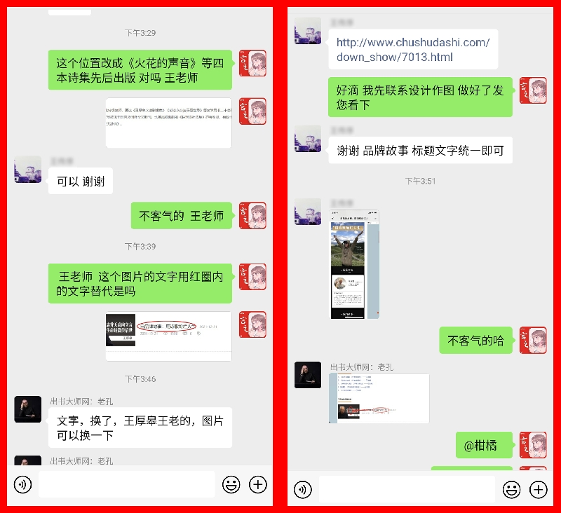 最近,作者邦网就与一位书作者客户进行了仔细的信息服务沟通交流。双方针对客户品牌页面上的图片信息调整更换、客户经历信息内容的修正、品牌故事内容表达细节的完善等,进行了细致而周全的交流与探讨。并且,作者邦网团队还就书作者客户的宝贵意见认真对待,并立即采取行动细心、细致而又准确地将相关信息进行了修改和调整。从而,收获了客户的满意表态。