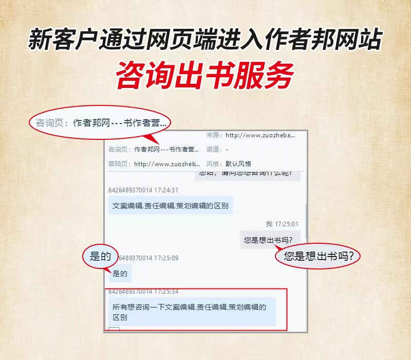 在本次服务升级当中,作者邦网依靠经纪人团队,于每天在不同自媒体平台传播推广书作者信息,以增加合作客户的全网品牌形象积累,以全面铺开营销品牌传播举措。同时,为了让书作者可以更友好、更直接地沟通和了解自己需要知道的问题、对接上自己的需求,作者邦网还开通了客服在线咨询功能。随着全网品牌营销服务的开展和推进,每天都有从百度、搜狗、360、谷歌等网站搜索到作者邦网站进行主动浏览的访客。更为主要的是,吸引到了许多新客户主动前来咨询出书等相关服务。