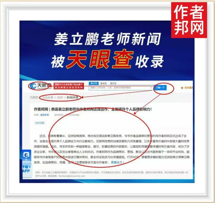 近日,作者邦网为书作者姜立鹏老师撰写的品牌策划文章于各大平台进行推广宣传,短时间内便迅速被百度、天眼查等权威媒介所收录。有效地提升了作者邦网与书作者的知名度与影响力等,并共同创造了有利的多方共赢局面。