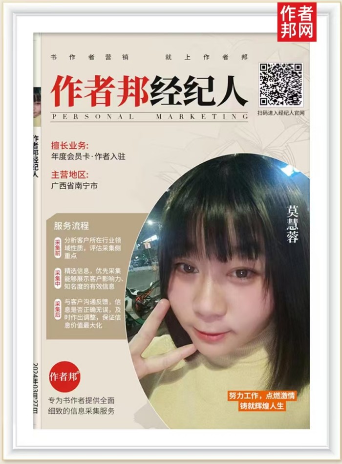 正式开展经纪人工作时,短时间内她便可以熟练地将客户的信息进行条理、清晰地实现搜集、归类以及整理。她把这些数据,有条不紊地上传到作者邦平台,并向客户进行沟通、核对以及调整,也收获了许多来自客户的赞扬与好评。面对经纪人这份副业,莫慧蓉表示,这对于自己的职业生涯来说,既是一次全新的挑战,也是一次自我进步的收获。对于经纪人事业,她有自己的想法,她非常希望,在经纪人领域耕耘的过程中,能够帮助到更多的书作者实现个人品牌打造,也能够不断地提升自我、以实现自我价值,在人生的奋斗旅程中,留下鲜艳而温和的生命色彩。
