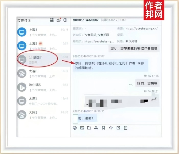 数据信息页面中还显示,法国访客从作者风采栏目进行咨询访问的时候,作者邦网经纪人耐心、专注而又细心地给予回复,从询问访客索要找的书作者以及访客的需求,到给出相关的信息答复,经纪人都显示出一种熟练、敬业而又热情的服务态度。并为促成访客和书作者的业务合作,提供了积极的助力和赋能。