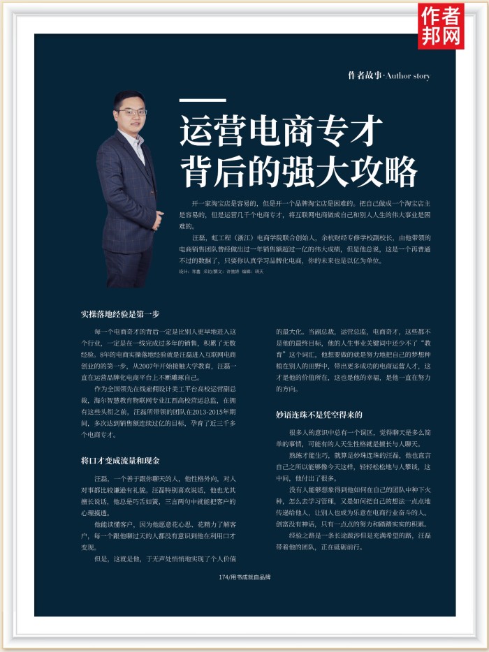 每一个电商奇才的背后一定是比别人更早地进入过个行业,一定是在一线完成过多年的销售,积累了无数经验。8年的电商实操落地经验就是汪磊进入互联网电商创业的的第一步,从2007年开始接触大学教育,汪磊直在运营品牌化电商平台上不断雕琢自己。