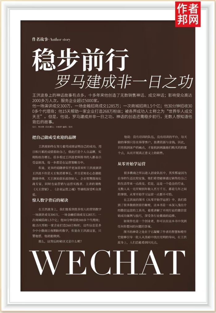 在王洪波身上,我们能看到很多惊人的营销数字场演讲成交300万,一场金融招商成交1285万;次商城招商1.5个亿;他30分钟招收300多个代理商;他15天帮助一家企业打造268万粉丝;这些信息是多少中小微商日夜期盼的数字,但是在王洪波这里,只要他想,他就能做到。