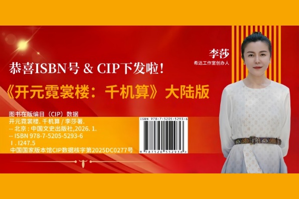 跨界学者李莎力作《开元霓裳楼·千机算》大陆版一书正式获得ISBN书号和CIP编号!该书聚焦盛唐长安霓裳楼,以一场灭门案揭开权谋、情仇与人性救赎的史诗画卷,由中国文史出版社权威出品。