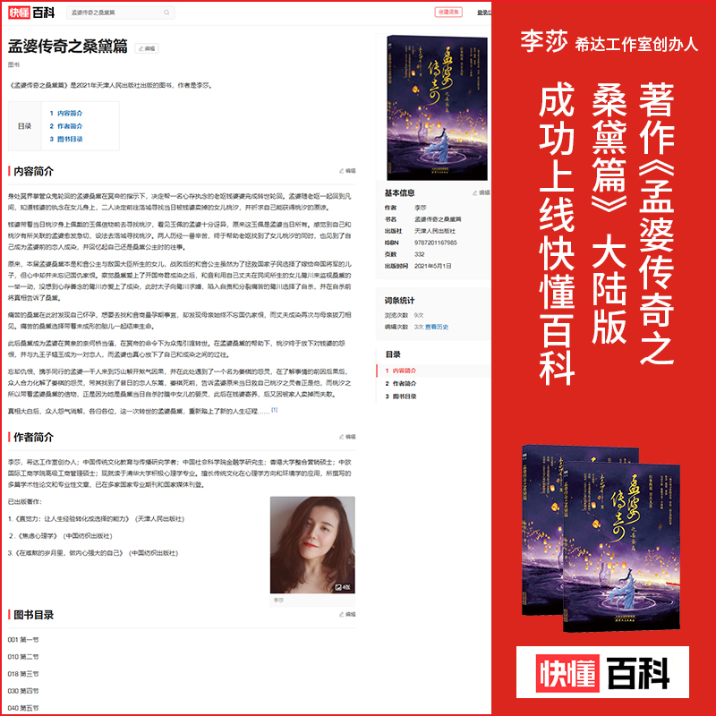 李莎:希达文化创始人李莎老师著作——《孟婆传奇之桑黛篇》大陆版,成功上线快懂百科