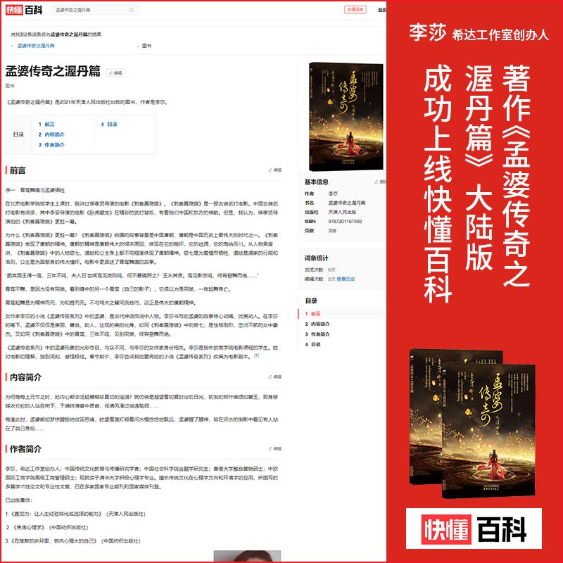 李莎:希达文化创始人李莎老师著作——《孟婆传奇之渥丹篇》,成功上线快懂百科
