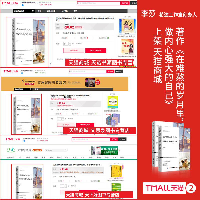 李莎:希达文化创始人李莎老师著作——《在难熬的岁月里,做内心强大的自己》上架知名购书渠道平台,天猫商城