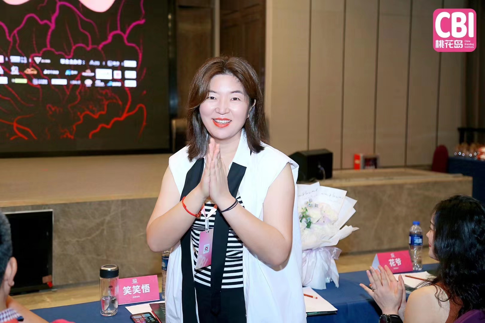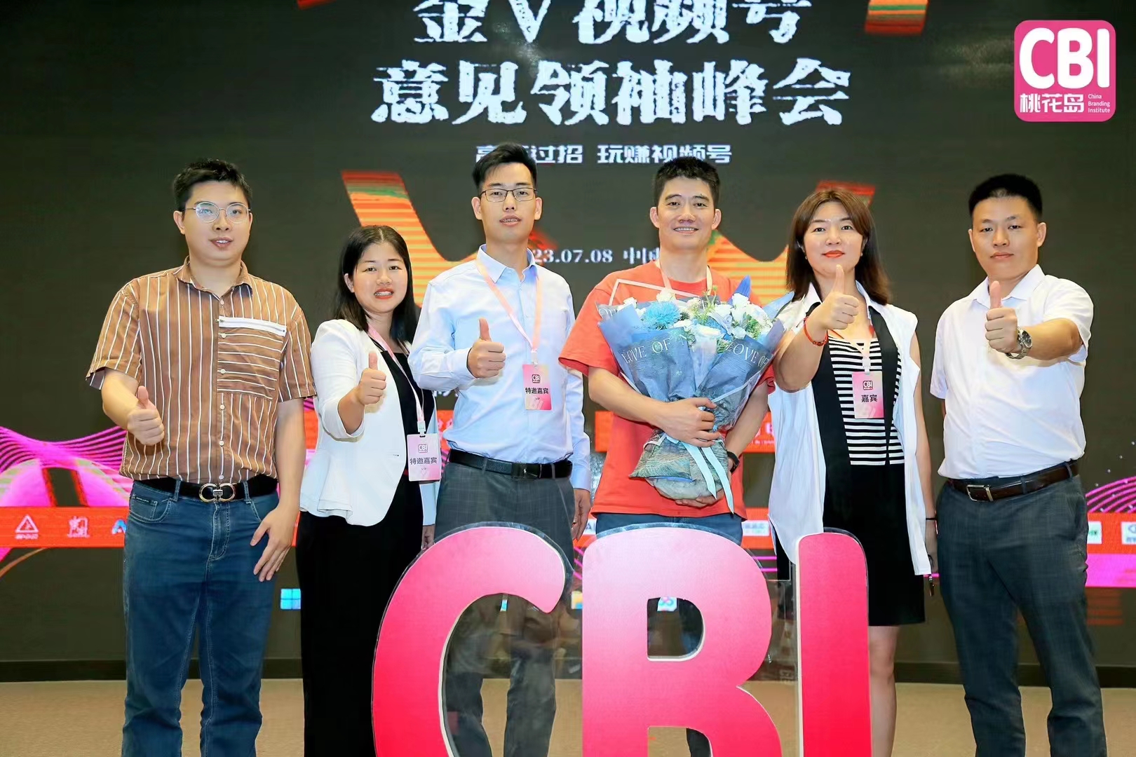 管鹏:笑笑悟老师在2023金V视频号意见领袖峰会上和朋友在台上合影