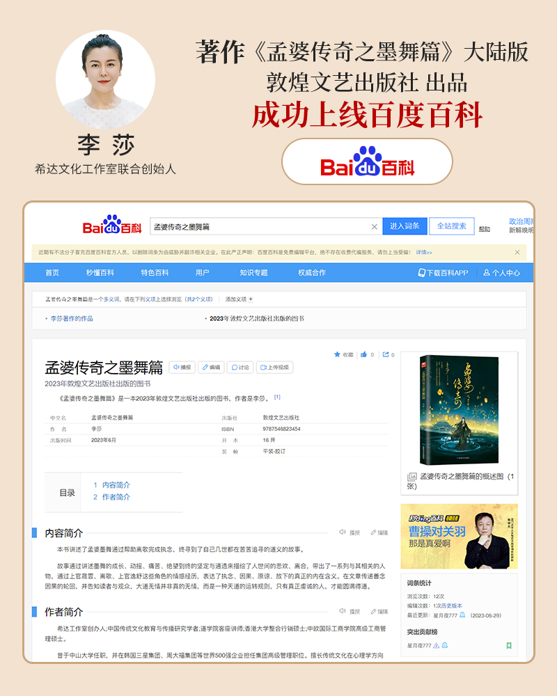李莎:《孟婆传奇之墨舞篇》大陆版,成功上线百度百科平台