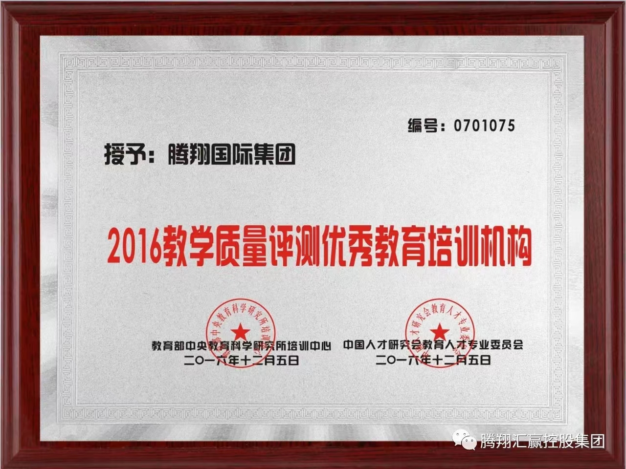 管鹏:中国人才研究会教育人才专业委员会授予腾翔国际集团2016教学质量评测优秀教育培训机构