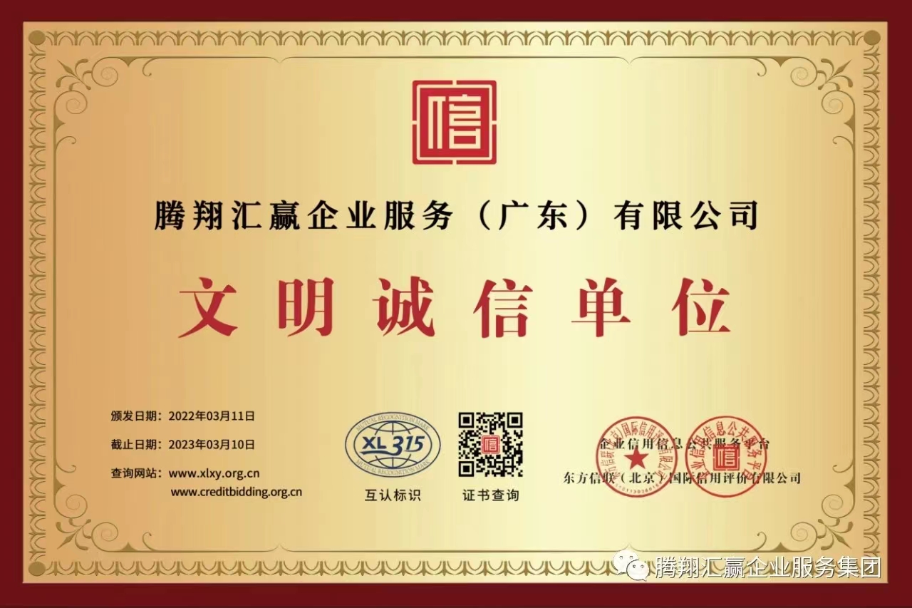 管鹏:企业信用信息公共服务平台授予腾翔汇赢企业服务(广东)有限公司文明诚信单位