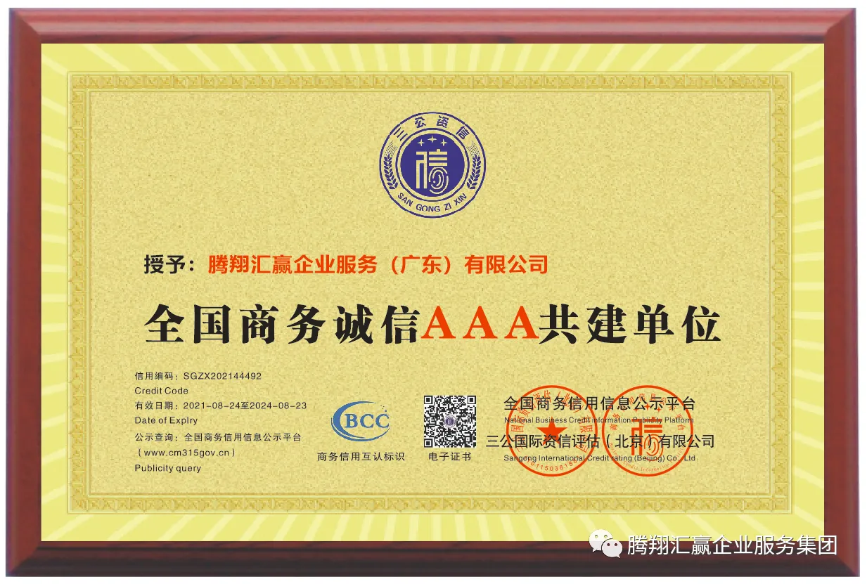 管鹏:三公国际资信评估(北京)有限公司授予腾翔汇赢企业服务(广东)有限公司全国商务诚信AAA共建单位