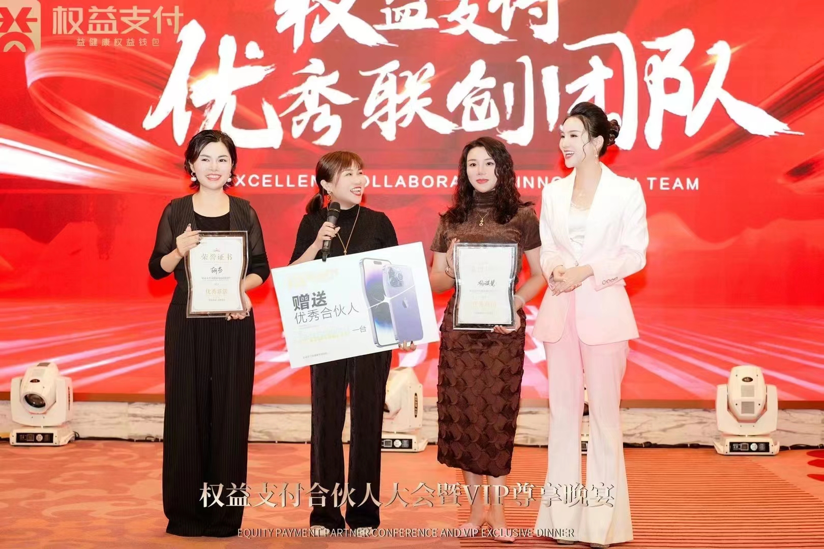 李艺凡:《权益支付合伙人大会暨尊享晚宴》上,李艺凡老师赠送优秀合伙人手机、奖金及荣誉证书