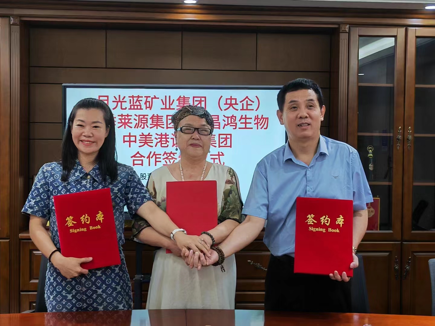吕丽琴:四季莱源董事长吕丽琴老师与月光蓝矿业、昌鸿生物签约完成后合影留念,共创辉煌未来