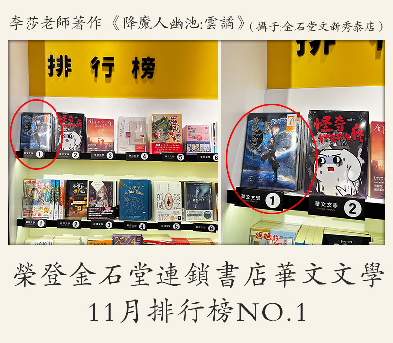 李莎:著作 《降魔人幽池:云谲》荣登金石堂连锁书店华文文学 11月排行榜NO.1 (摄于:金石堂 左營店)