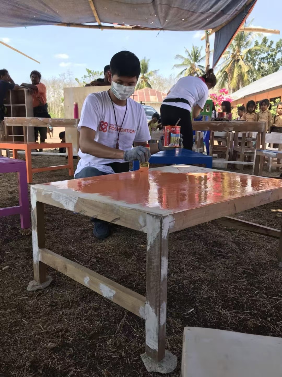 杨杨:杨杨老师和俱乐部成员给小朋友分发物资现场照片