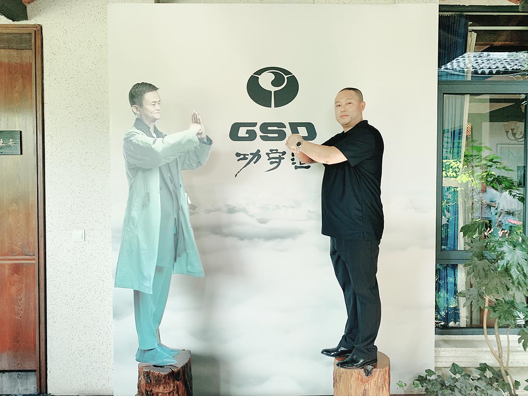 汪东清:参观阿里巴巴企业内部,汪东清老师与马云雕像拱手作辑