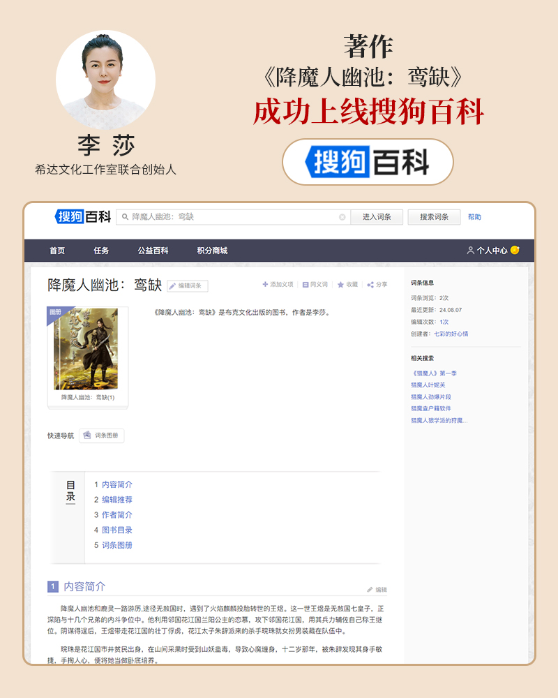 李莎:《降魔人幽池:鸾缺》成功上架搜狗百科