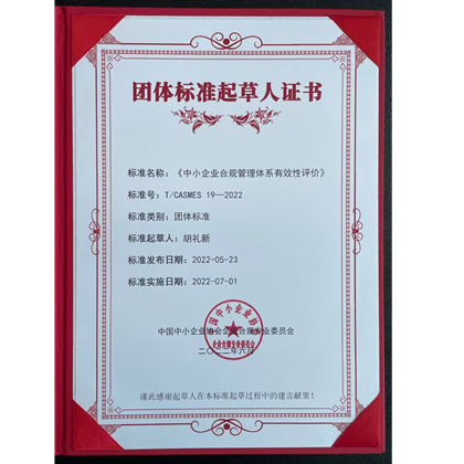 胡礼新律师受邀成为《中小企业合规管理体系有效性评价》团体标准起草人,并发证书作纪念。