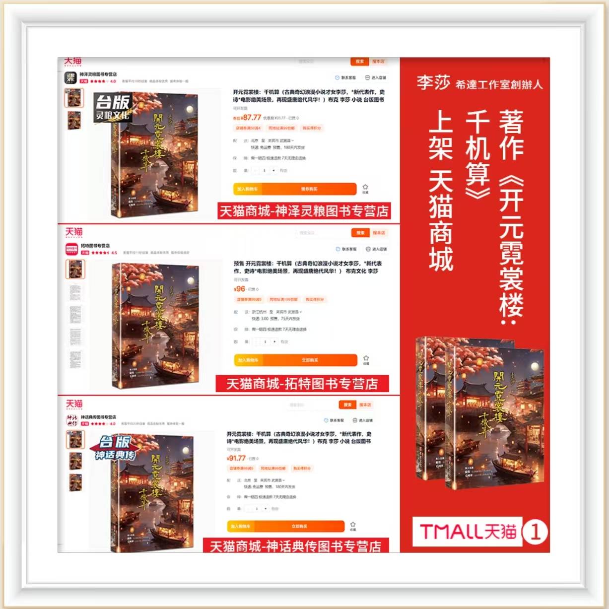 畅销书作家李莎老师新书,《开元霓裳楼:千机算》成功上架淘宝、京东、天猫、当当各大平台,这本书以其独特的视角和深刻的洞察力,为读者呈现了一个既神秘又引人入胜的世界。