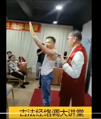 古法经络讲堂课程学习,老师现场三分钟调理学员肩周炎,原来学员手臂不能上举,不能从背后上抬,通过老师扣痧技术进行拍打调理后,仅仅三分钟效果显著。