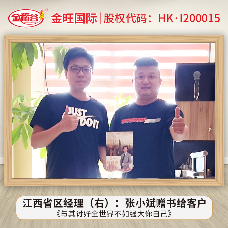 金稻谷品牌金旺国际集团江西省区经理张小斌,赠予客户陈瑞武老师书籍,与客户沟通交流开拓消费者市场