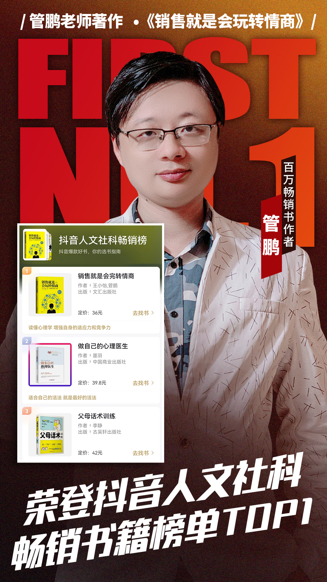 赋商会创始人,百万畅销书作者管鹏老师,作品《销售就是会玩转情商》,全网热销超400万册,书籍受到各行业销售人员的欢迎与肯定,荣登抖音人文社科书籍畅销榜单TOP1