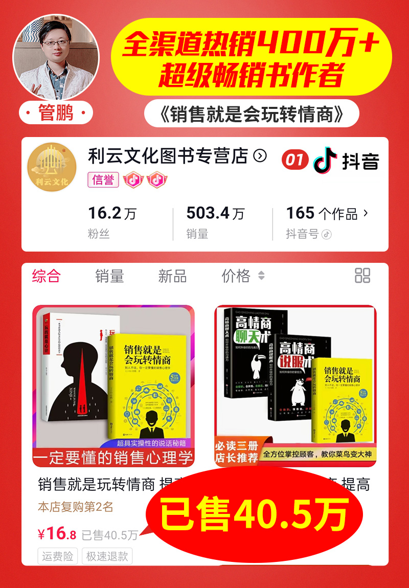 K大咖创始人管鹏,百万畅销著作《销售就是会玩转情商》——抖音平台书籍销量统计合集,全网爆火热销超400万册,掌握顾客心理,了解购买产品的人心理,才能实现成交。