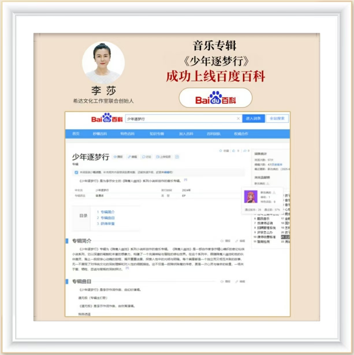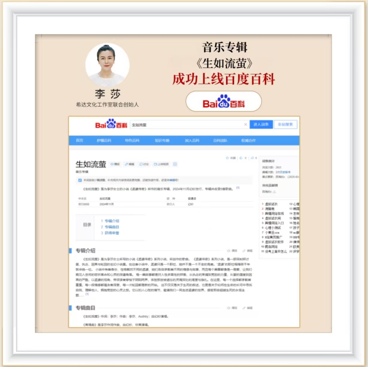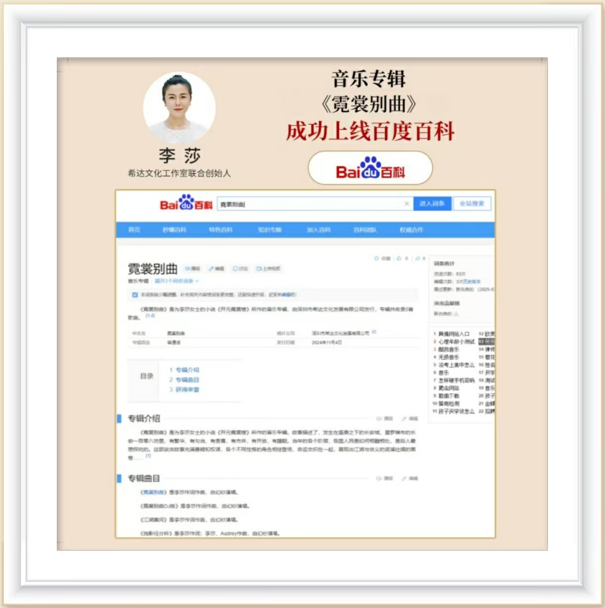 独立音乐人李莎老师音乐专辑《霓裳别曲》,成功上线百度百科,《霓裳别曲》是为李莎女士的小说《开元霓裳楼》所作的音乐专辑,专辑上线就获得腾讯QQ音乐飙升榜第68名。