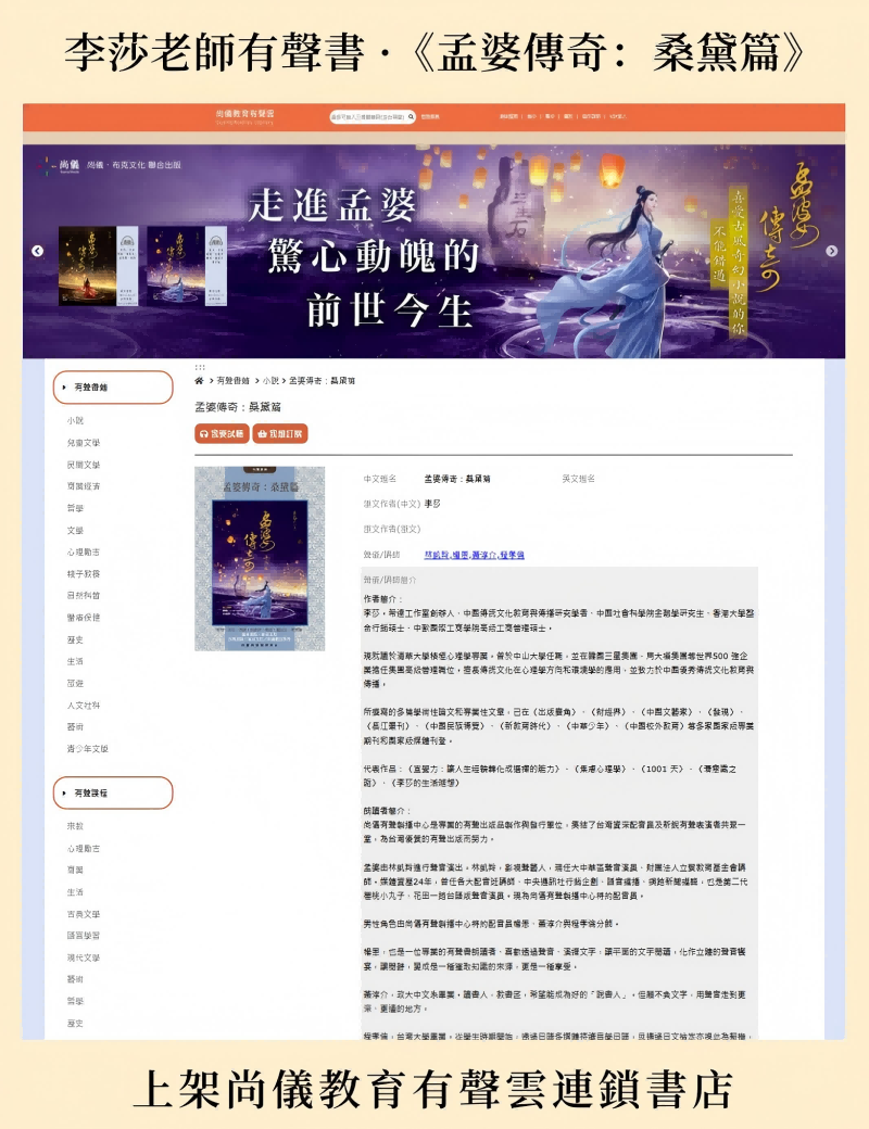 《孟婆传奇:桑黛篇》有声书震撼上线博客来连锁书店!李莎笔下的孟婆,不在是无情的遗忘者,而是轮回中的守望者,是爱恨交织的传奇。在冥界的彼岸,她阅尽红尘悲欢,却藏着自己的千年执念。
