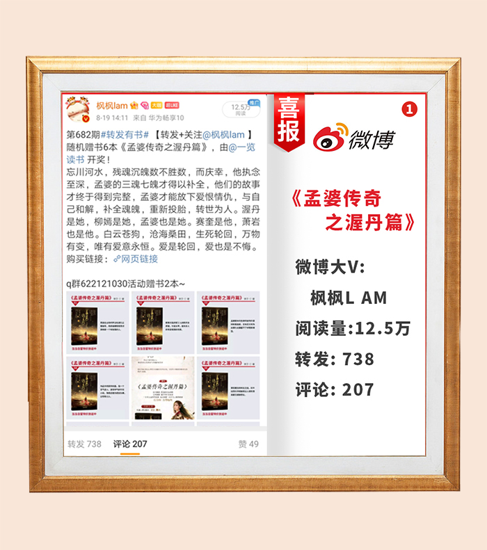 希达文化创始人李莎老师的著作:《孟婆传奇之桑黛篇》——微博大V转发数据海报图展示,由数名微博大V转发,深受广大网友喜爱,微博浏览量可观,转发及评论呼声很高。