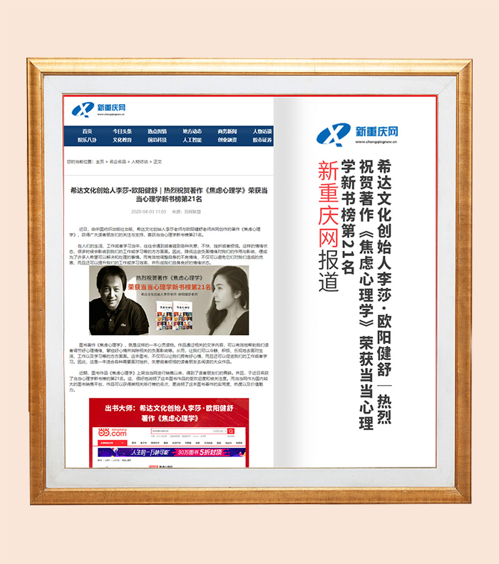 热烈祝贺希达文化创始人李莎老师、欧阳建舒老师的著作——《焦虑心理学》,荣获当当网心理学新书榜第21名,很好的说明了这本书受欢迎度与被关注度,也体现了书籍的实用性。