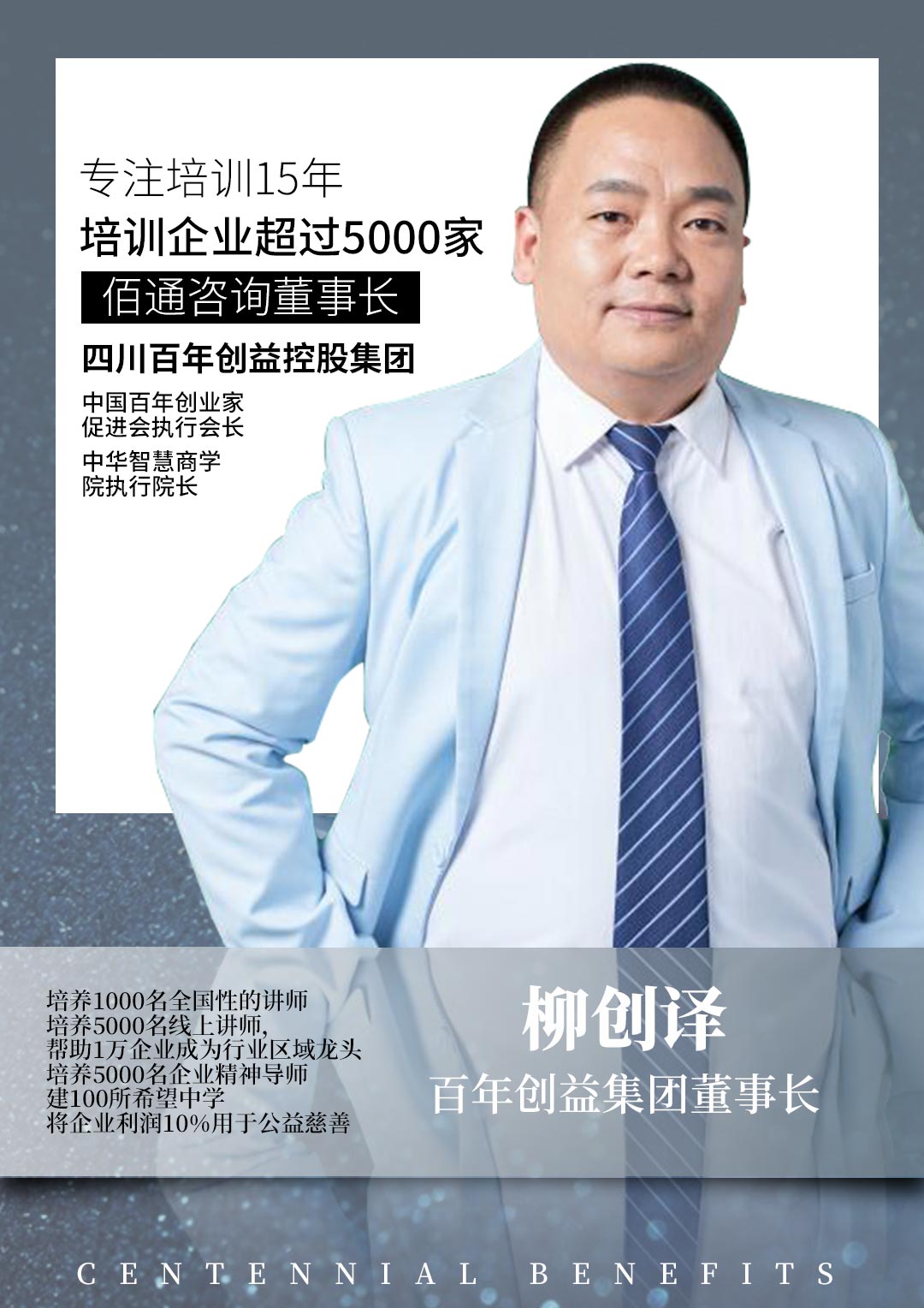柳创译 1979年出生于四川省大凉山西昌 百年创益集团董事长; 中国百年创业家促进会执行会长; 中华智慧商学院执行院长; 佰通咨询董事长;