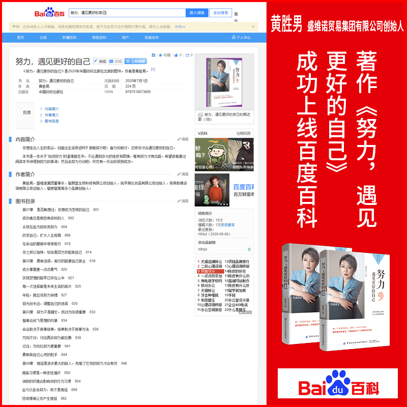 畅销书作者黄胜男老师的出版作品《努力,遇见更好的自己》——成功上线百度百科,百度百科旨创造了一个涵盖各领域知识的中文信息收集平台,是国内最权威百科平台。
