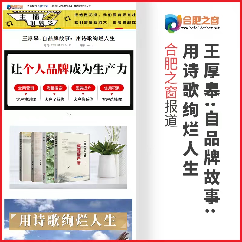 合肥之窗报道:江苏省特级教育工作者【王厚皋】老师——自品牌故事:用诗歌绚烂人生!自品牌故事让个人品牌成为生产力,全网营销个人信息、海量搜索个人信息、个人品牌提升、个人信用积累。