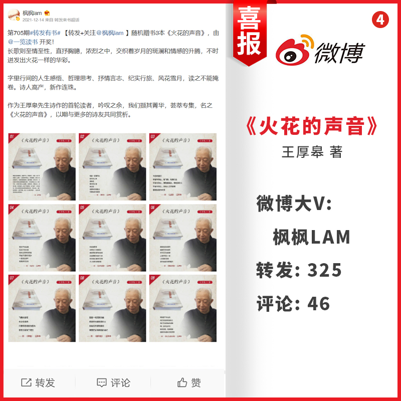 微博大V发文向大众推荐王厚皋老师诗作《火花的声音》浏览量,转发量,评论量都达到了不错的热度!作为王厚皋先生诗作的首轮读者,吟叹之余,撷其菁华,我们荟萃专集,名之《火花的声音》。