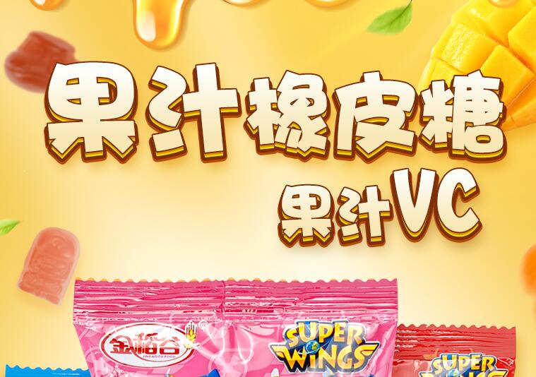 金稻谷果汁橡皮糖,含有丰富的VC,真实新鲜果汁,真材实料,优质葡萄原浆,甜度适中,精选白砂糖,清甜调味,一颗颗的优质Q弹橡皮糖就诞生了,多种可爱造型,萌翻大众。