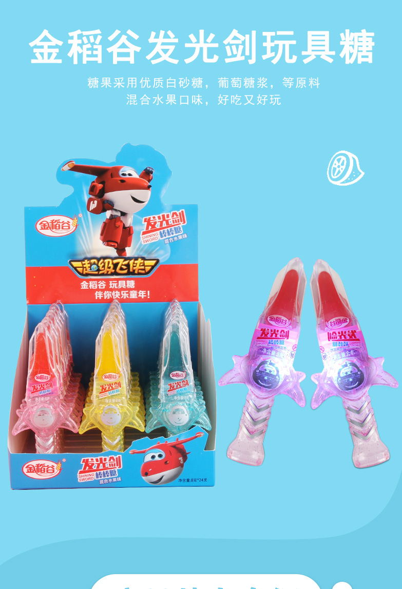 金稻谷发光剑棒棒糖,伴你快乐童年,可以吃的发光剑,经典的融合,加上乐趣的玩具,体验了不一样的感知,让我们玩的同时还可以享受乐趣,金稻谷专业儿童食品15年。