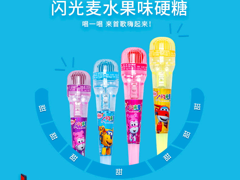 闪光麦水果味硬糖,好玩又有趣的玩具糖,闪光麦克风,乐趣无限,多种玩法,唱一唱,来首歌嗨起来,经典的融合加上乐趣的玩具,款式众多,加上超级飞侠正版IP授权。