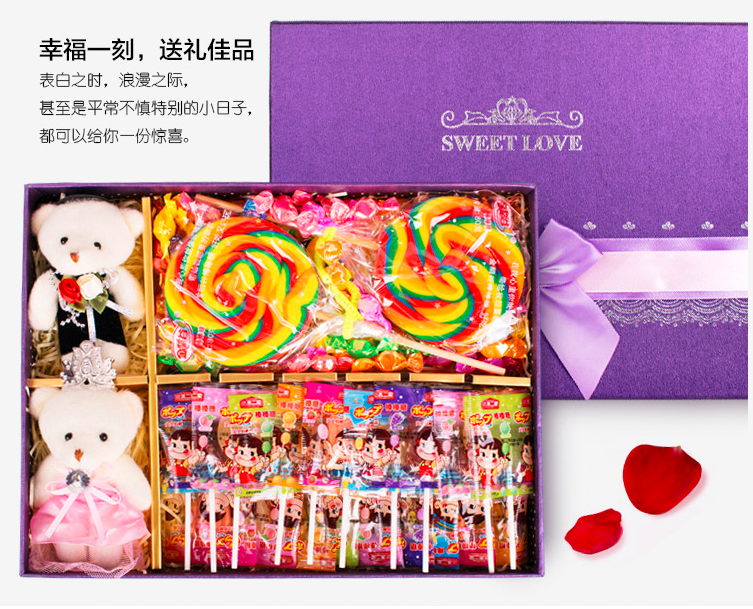 幸福专属,送给爱的人一份爱的礼物,金稻谷超大糖果组合礼盒,精美铁质礼盒,三种不同的糖果组合,体验不同的甜蜜,精美礼品袋,送给爱人,不二家的棒棒糖,千纸鹤糖果。