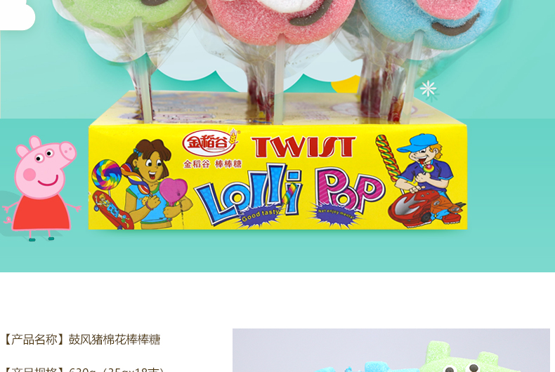 小猪佩奇棉花糖,甜蜜从糖果开始,卡爱造型,鼓风猪造型,萌翻全场,酥软美味,一口棉花棒棒糖满嘴的幸福甜蜜,萌趣造型,小孩大人都喜欢,生动微笑表情造型,吃有颜值。