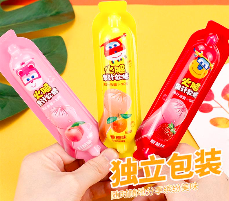 金稻谷火腿果汁软糖,添加真果汁,每一个都很用心,我们有真实的果汁,一口真果汁,超级飞侠正版IP授权,三种水果味,满足你的味蕾,支支吃出幸福感,独有的的清甜滋味。